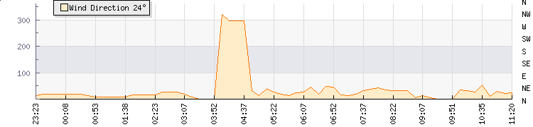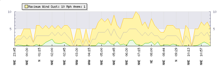 In the last few minutes the wind was North North West at an average speed of 2 mph, reaching up to 5 mph and a low of 0 mph. The gust strength is5 mph above the minimum speed |