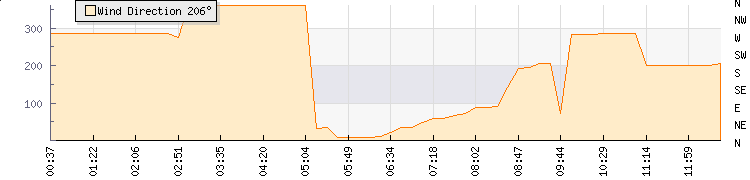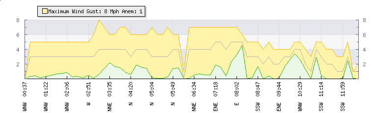 In the last few minutes the wind was West North West at an average speed of 1 mph, reaching up to 3 mph and a low of 0 mph. The gust strength is3 mph above the minimum speed |