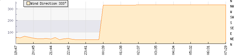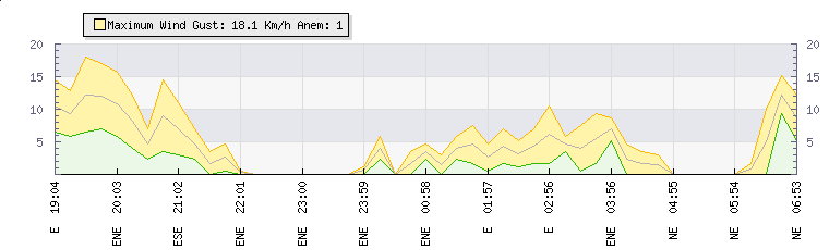 In the last few minutes the wind was North Easterly at an average speed of 0 kmh, reaching up to 0 kmh and a low of 0 kmh. The gust strength is0 kmh above the minimum speed |