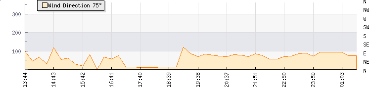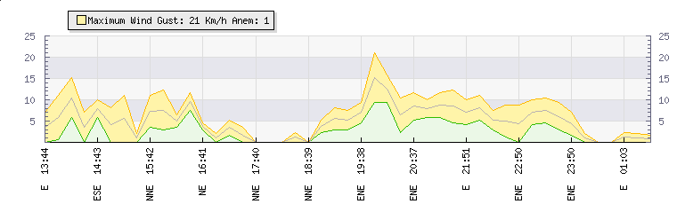 In the last few minutes the wind was Easterly at an average speed of 0 kmh, reaching up to 0 kmh and a low of 0 kmh. The gust strength is0 kmh above the minimum speed |
