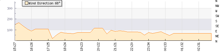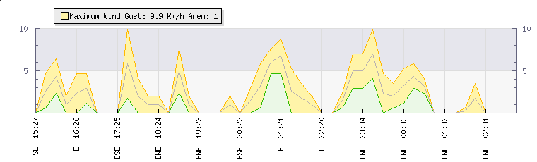 In the last few minutes the wind was North North East at an average speed of 6 kmh, reaching up to 10 kmh and a low of 2 kmh. The gust strength is8 kmh above the minimum speed |