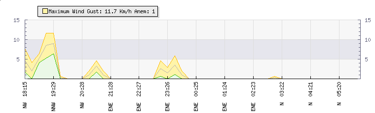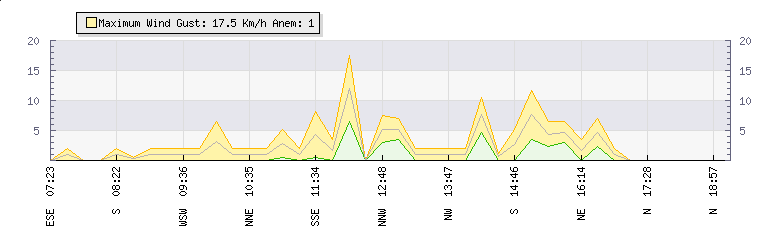 In the last few minutes the wind was Northerly at an average speed of 0 kmh, reaching up to 0 kmh and a low of 0 kmh. The gust strength is0 kmh above the minimum speed |
