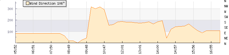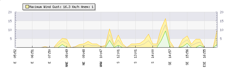 In the last few minutes the wind was Easterly at an average speed of 0 kmh, reaching up to 0 kmh and a low of 0 kmh. The gust strength is0 kmh above the minimum speed |