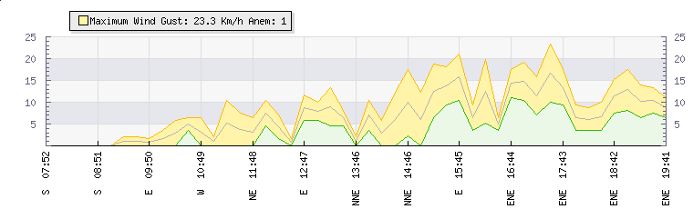 In the last few minutes the wind was North Easterly at an average speed of 6 kmh, reaching up to 9 kmh and a low of 4 kmh. The gust strength is5 kmh above the minimum speed |