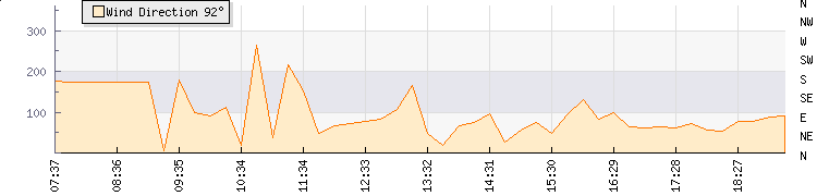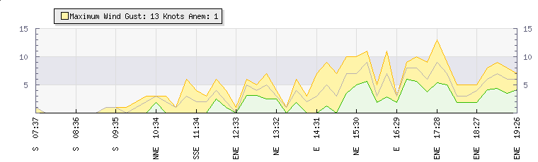 In the last few minutes the wind was North Easterly at an average speed of 3 knots, reaching up to 5 knots and a low of 2 knots. The gust strength is3 knots above the minimum speed |