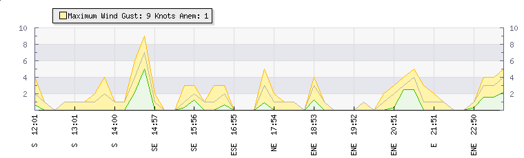 In the last few minutes the wind was Southerly at an average speed of 1 knots, reaching up to 2 knots and a low of 0 knots. The gust strength is2 knots above the minimum speed |