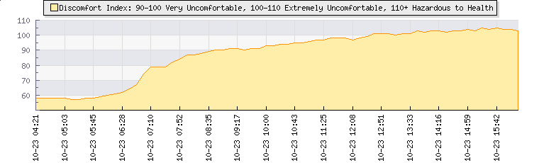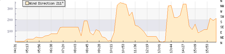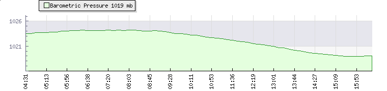 Wind Speed: | -|-|- kmh | Wind Direction: | SE 142° | Temperature: | 31.3°C | Wet Bulb: | 20.9°C | Discomfort: | 98 | Humidity: | 37% | Rainfall Today: | 0mm | 12 hrs Rainfall: | 0mm | 24 hrs Rainfall: | 0mm | Barometer: | 1021.9mb | Dew Point: | 14.9°C | Clouds AGL: | 6583ft (2006 m) | Density-Alt: | 5620ft (1713 m) | Solar Radiation: | 166Wm² |
