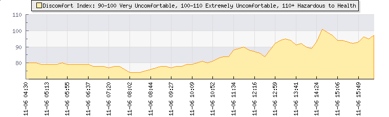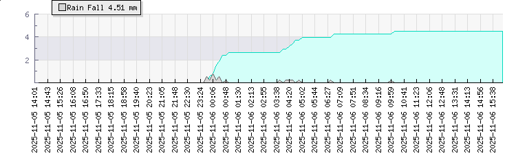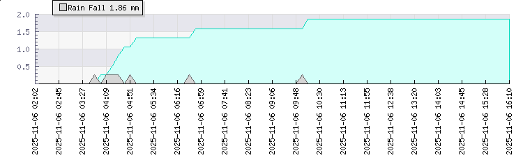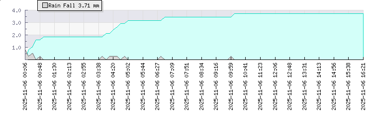 | Wind Speed: | -|-|- kmh | Wind Direction: | NE 44° | Temperature: | 25.7°C | | Wet Bulb: | 21°C | Discomfort: | 92 | Humidity: | 66% | | Rainfall Today: | 3.7mm | 12 hrs Rainfall: | 1.9mm | 24 hrs Rainfall: | 4.5mm | | Barometer: | 1020.1mb | Dew Point: | 18.9°C | Clouds AGL: | 2736ft (834 m) | | Density-Alt: | 5128ft (1563 m) | Solar Radiation: | 152Wm² |