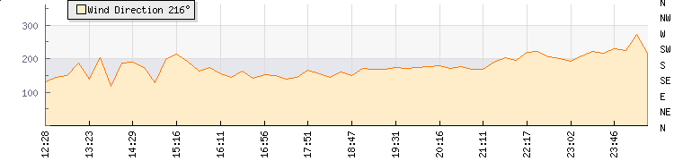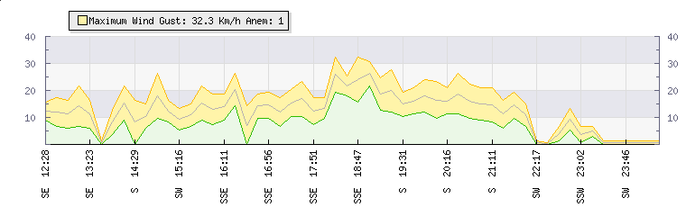 In the last few minutes the wind was South Westerly at an average speed of 1 kmh, reaching up to 2 kmh and a low of 0 kmh. The gust strength is2 kmh above the minimum speed |