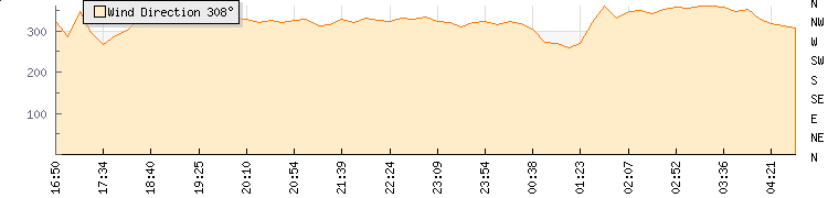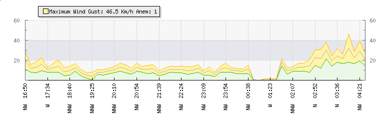 In the last few minutes the wind was West North West at an average speed of 16 kmh, reaching up to 23 kmh and a low of 10 kmh. The gust strength is13 kmh above the minimum speed |