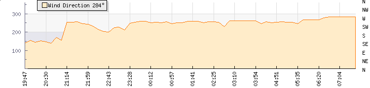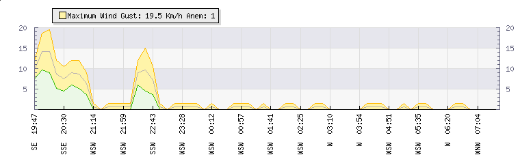 In the last few minutes the wind was Westerly at an average speed of 0 kmh, reaching up to 0 kmh and a low of 0 kmh. The gust strength is0 kmh above the minimum speed |