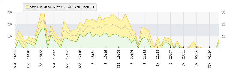 In the last few minutes the wind was South South East at an average speed of 3 kmh, reaching up to 6 kmh and a low of 0 kmh. The gust strength is6 kmh above the minimum speed |