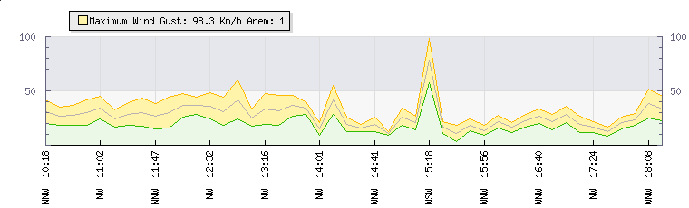 In the last few minutes the wind was North Westerly at an average speed of 20 kmh, reaching up to 27 kmh and a low of 12 kmh. The gust strength is15 kmh above the minimum speed |