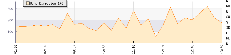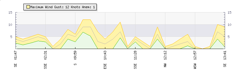 In the last few minutes the wind was East South East at an average speed of 9 knots, reaching up to 12 knots and a low of 5 knots. The gust strength is7 knots above the minimum speed |