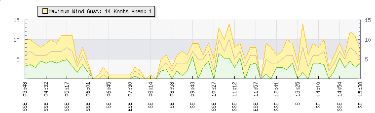 In the last few minutes the wind was South Easterly at an average speed of 6 knots, reaching up to 8 knots and a low of 4 knots. The gust strength is4 knots above the minimum speed |