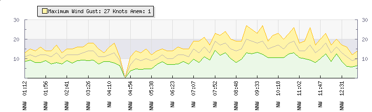In the last few minutes the wind was North North West at an average speed of 13 knots, reaching up to 17 knots and a low of 8 knots. The gust strength is9 knots above the minimum speed |