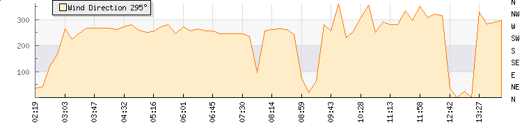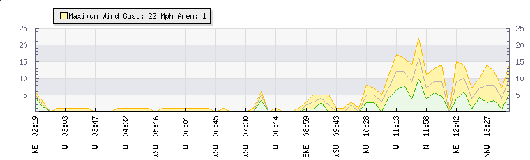 In the last few minutes the wind was North Westerly at an average speed of 1 mph, reaching up to 1 mph and a low of 0 mph. The gust strength is1 mph above the minimum speed |
