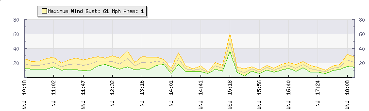 In the last few minutes the wind was North Westerly at an average speed of 12 mph, reaching up to 17 mph and a low of 7 mph. The gust strength is10 mph above the minimum speed |