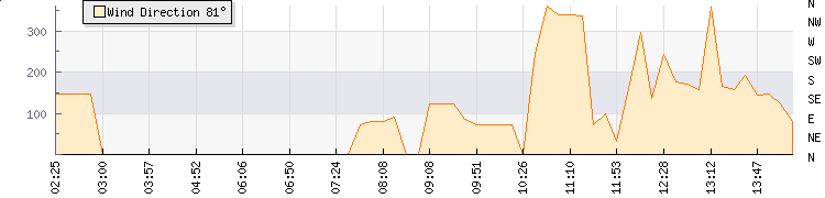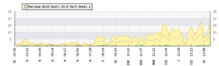 In the last few minutes the wind was Southerly at an average speed of 6 kmh, reaching up to 13 kmh and a low of 0 kmh. The gust strength is13 kmh above the minimum speed |