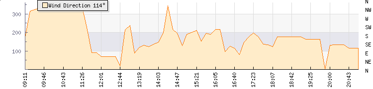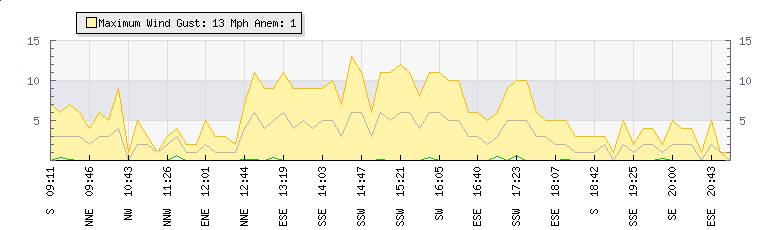 In the last few minutes the wind was South Easterly at an average speed of 3 mph, reaching up to 6 mph and a low of 0 mph.  The gust strength is6 mph above the minimum speed             |
