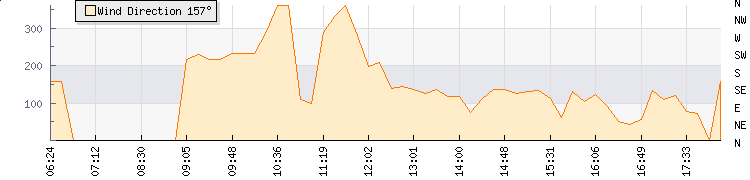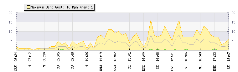 In the last few minutes the wind was South Easterly at an average speed of 8 mph, reaching up to 16 mph and a low of 0 mph. The gust strength is16 mph above the minimum speed |