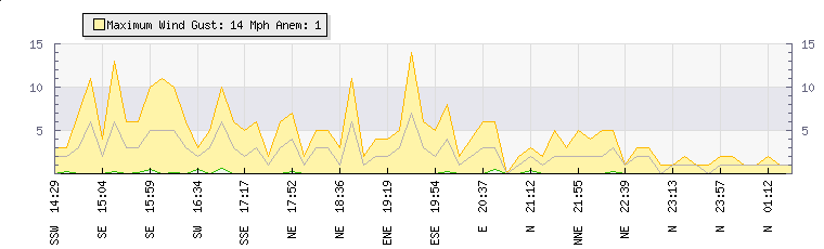 In the last few minutes the wind was Northerly at an average speed of 1 mph, reaching up to 1 mph and a low of 0 mph. The gust strength is1 mph above the minimum speed |