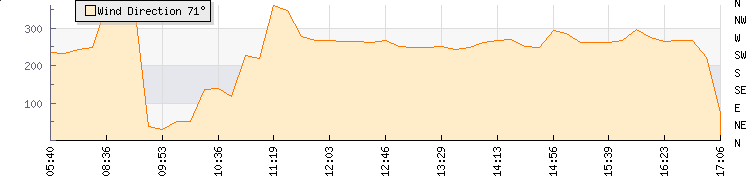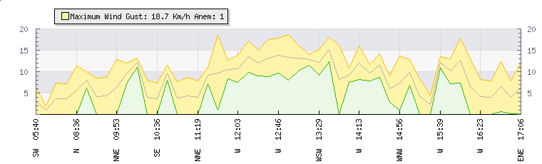 In the last few minutes the wind was Westerly at an average speed of 2 kmh, reaching up to 5 kmh and a low of 0 kmh. The gust strength is5 kmh above the minimum speed |