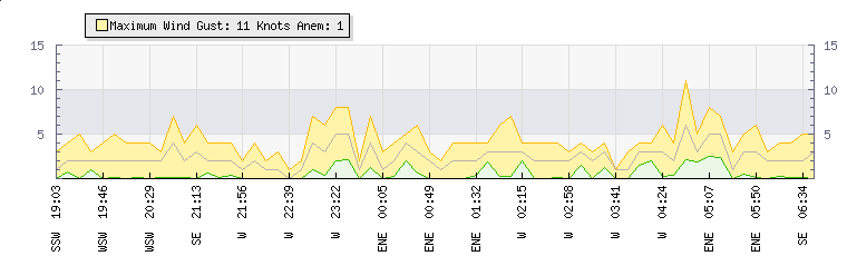 In the last few minutes the wind was North Easterly at an average speed of 5 knots, reaching up to 7 knots and a low of 2 knots. The gust strength is5 knots above the minimum speed |