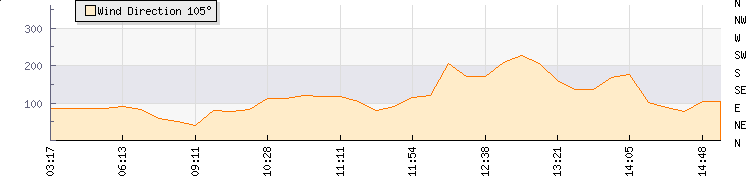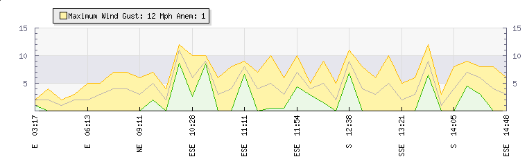 In the last few minutes the wind was South South West at an average speed of 5 mph, reaching up to 10 mph and a low of 0 mph. The gust strength is10 mph above the minimum speed |