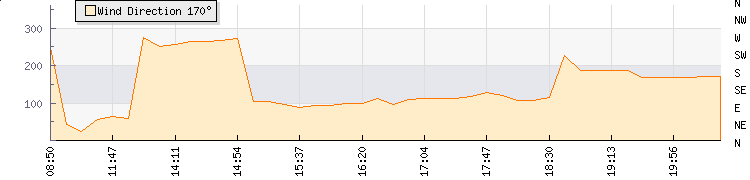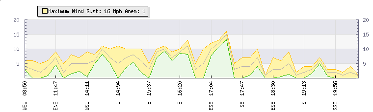 In the last few minutes the wind was Southerly at an average speed of 1 mph, reaching up to 2 mph and a low of 0 mph. The gust strength is2 mph above the minimum speed |