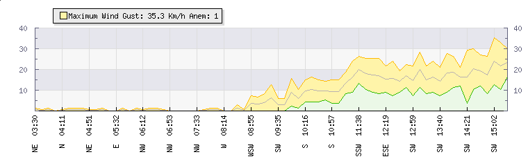 In the last few minutes the wind was South Westerly at an average speed of 15 kmh, reaching up to 22 kmh and a low of 8 kmh. The gust strength is14 kmh above the minimum speed |