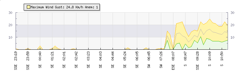 In the last few minutes the wind was South Easterly at an average speed of 1 kmh, reaching up to 1 kmh and a low of 0 kmh. The gust strength is1 kmh above the minimum speed |