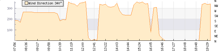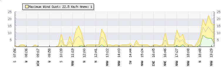 In the last few minutes the wind was North North West at an average speed of 6 kmh, reaching up to 12 kmh and a low of 1 kmh. The gust strength is11 kmh above the minimum speed |