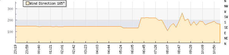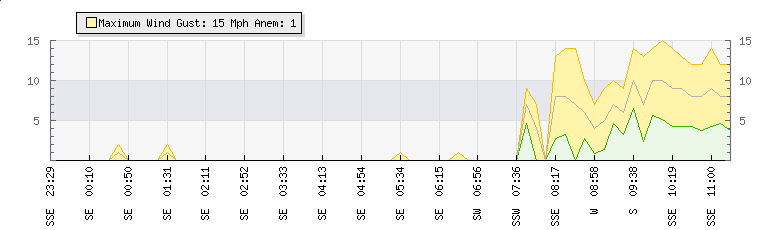 In the last few minutes the wind was South Easterly at an average speed of 1 mph, reaching up to 2 mph and a low of 0 mph. The gust strength is2 mph above the minimum speed |