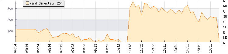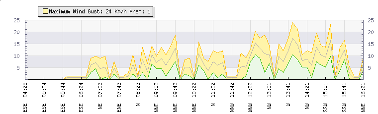 In the last few minutes the wind was North Westerly at an average speed of 9 kmh, reaching up to 12 kmh and a low of 5 kmh. The gust strength is7 kmh above the minimum speed |