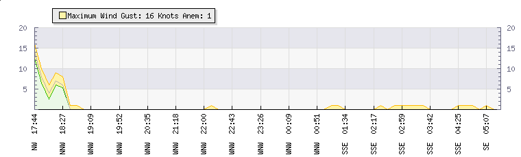 In the last few minutes the wind was South South East at an average speed of 1 knots, reaching up to 1 knots and a low of 0 knots. The gust strength is1 knots above the minimum speed |