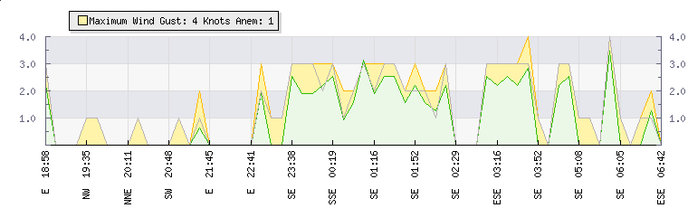 In the last few minutes the wind was East South East at an average speed of 1 knots, reaching up to 1 knots and a low of 0 knots. The gust strength is1 knots above the minimum speed |