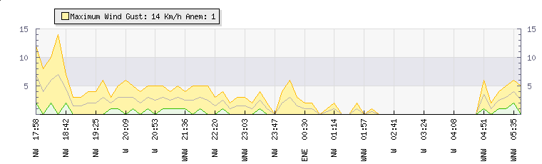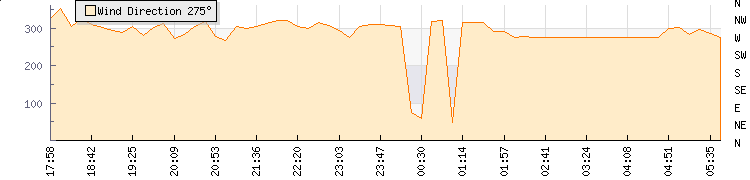 In the last few minutes the wind was Westerly at an average speed of 0 kmh, reaching up to 0 kmh and a low of 0 kmh. The gust strength is0 kmh above the minimum speed |