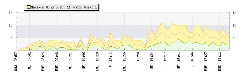 In the last few minutes the wind was Easterly at an average speed of 7 knots, reaching up to 10 knots and a low of 3 knots. The gust strength is7 knots above the minimum speed |