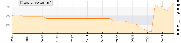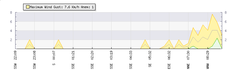 In the last few minutes the wind was South South West at an average speed of 0 kmh, reaching up to 0 kmh and a low of 0 kmh. The gust strength is0 kmh above the minimum speed |