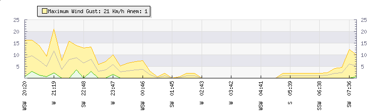 In the last few minutes the wind was South South West at an average speed of 1 kmh, reaching up to 2 kmh and a low of 0 kmh. The gust strength is2 kmh above the minimum speed |