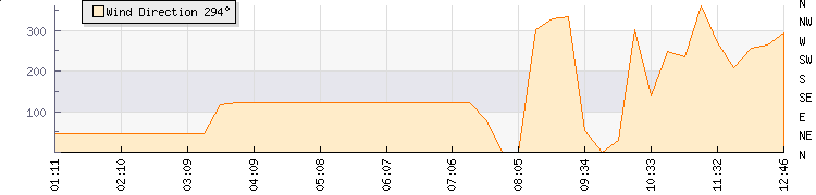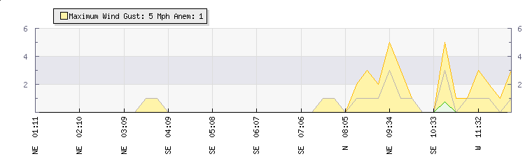 In the last few minutes the wind was North North East at an average speed of 1 mph, reaching up to 1 mph and a low of 0 mph. The gust strength is1 mph above the minimum speed |