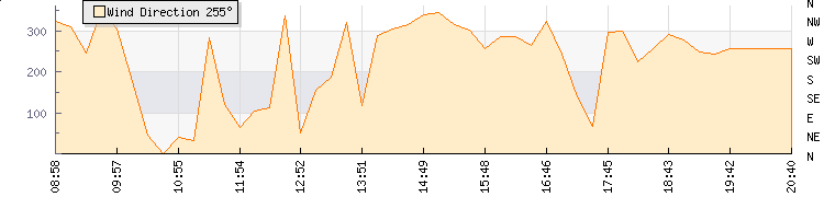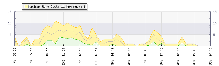 In the last few minutes the wind was West South West at an average speed of 1 mph, reaching up to 1 mph and a low of 0 mph. The gust strength is1 mph above the minimum speed |