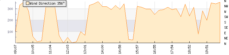In the last few minutes the wind was East North East at an average speed of 1 mph, reaching up to 2 mph and a low of 0 mph. The gust strength is2 mph above the minimum speed |