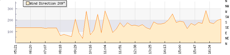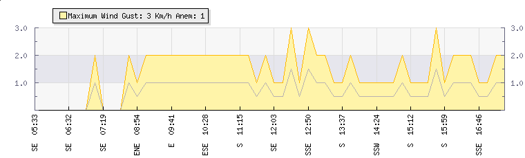In the last few minutes the wind was South Easterly at an average speed of 0 kmh, reaching up to 0 kmh and a low of 0 kmh. The gust strength is0 kmh above the minimum speed |
