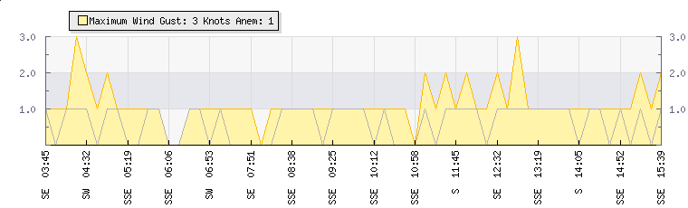 In the last few minutes the wind was East South East at an average speed of 1 knots, reaching up to 1 knots and a low of 0 knots. The gust strength is1 knots above the minimum speed |