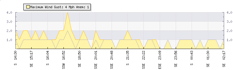 In the last few minutes the wind was South South East at an average speed of 1 mph, reaching up to 1 mph and a low of 0 mph. The gust strength is1 mph above the minimum speed |
