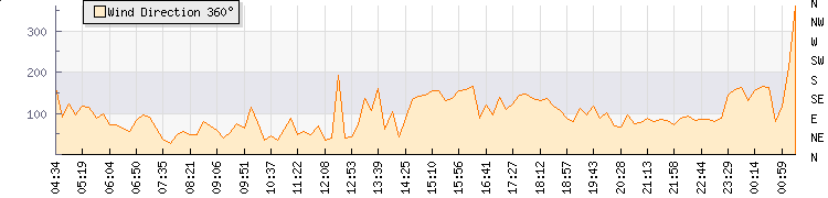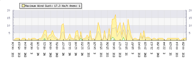In the last few minutes the wind was Easterly at an average speed of 1 kmh, reaching up to 1 kmh and a low of 0 kmh. The gust strength is1 kmh above the minimum speed |