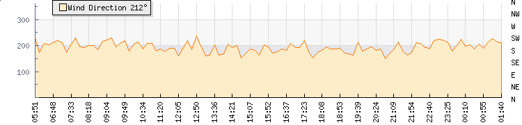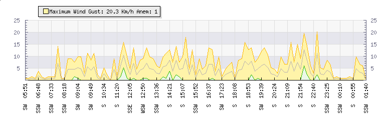 In the last few minutes the wind was South South West at an average speed of 1 kmh, reaching up to 1 kmh and a low of 0 kmh. The gust strength is1 kmh above the minimum speed |