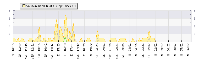 In the last few minutes the wind was Easterly at an average speed of 1 mph, reaching up to 1 mph and a low of 0 mph. The gust strength is1 mph above the minimum speed |
